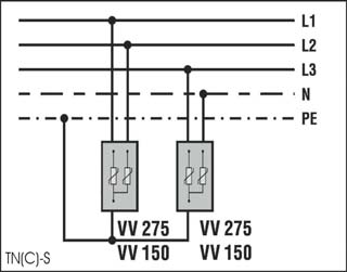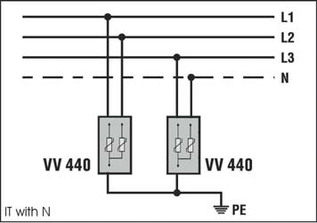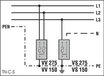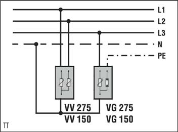 For proper installation the over voltage arrester must be mounted into the system between phase (L) and ground conductor (PEN, PE). In TN-S and IT systems surge protection device must be installed between neutral N and ground conductor PE either. In TT systems special rule is valid; it means gas discharge tube must be installed between neutral N and ground PE conductor. Gas discharge tube is needed in case of phase-ground connection the high potential is transferred to the earth and housing of apparatus, which is not connected to the same potential level may present risk for human life. Gas discharge tube installation reaches galvanic separation between conductors and breaking of electrical circuit in first period.