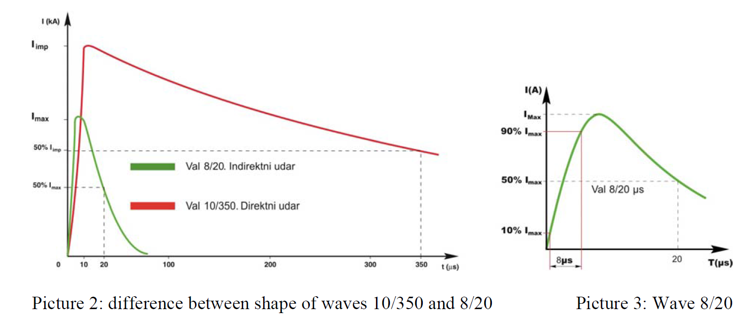 Above picture (picture 2) illustrate the difference between current impulses shape of waves 10/350 and 8/20. Square dimension under curve can be imagining, as energy of the strike. According to energy equation or Joule integral easy calculation can be done to proof that energy at direct strike is much higher.