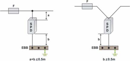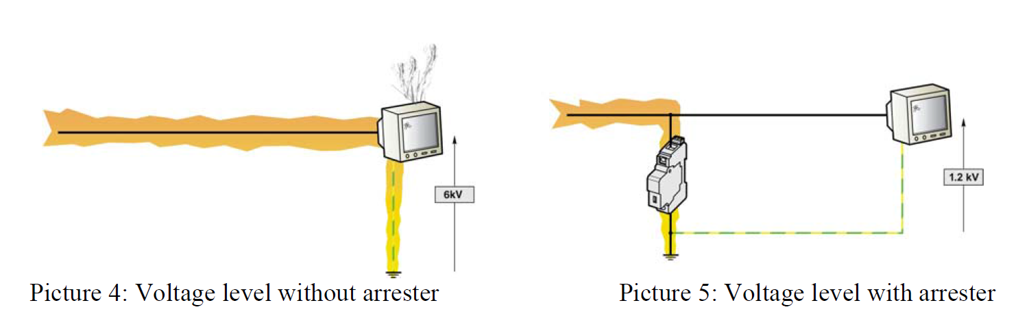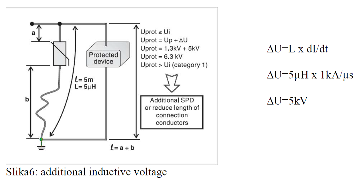 Main cause for irregular function of over voltage protection elements is un-considering the length of ground conductor PE, PEN. The length of the conductors influences additional inductive voltage drop as follows; a conductor length of 1m has an inductance of approximately 1μH, which at current steepness of 1kA/μs contributes approximately 1kV. Difference of voltage which appears because of additional conductor length must be considered with arresters Up voltage level, when reaching proper result.