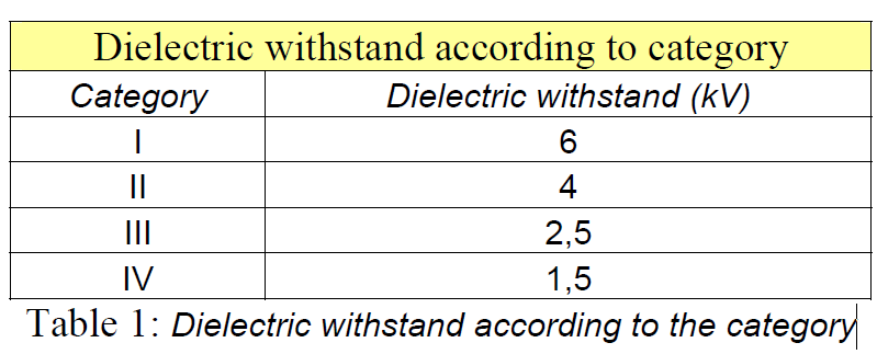 The goal of over voltage protection is to reach lower value of voltage level, as dielectric withstand of protected equipment. According to the standard IEC 61643 devices are divided into four groups-categories. Dielectric withstand must be given by the each manufacturer.