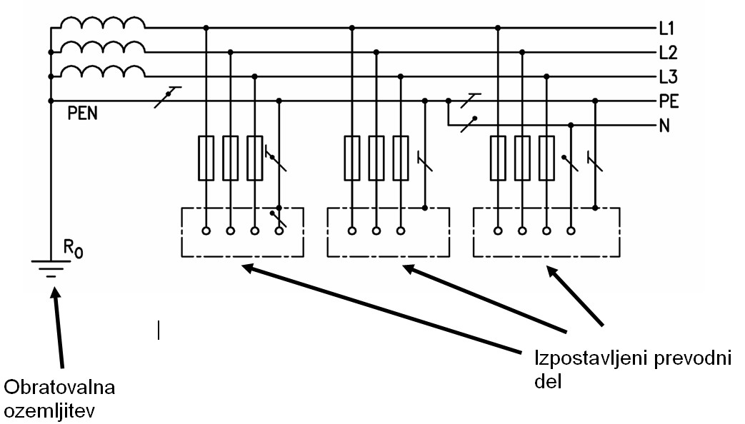 An important element in protecting people (including property and animals) from the effects of electric current is grounding the part – the point of the electrical power supply system (e.g., a 20/0.4 kV transformer station from which a building is powered) and grounding exposed conductive parts. The exposed conductive part (such as the stove housing) is normally not under voltage, but if the phase conductor comes into contact with the housing due to a fault, it can be dangerous if touched.