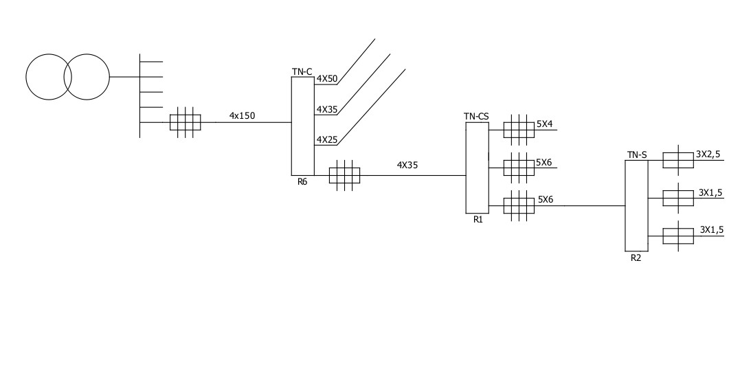 Figure 2 shows a branched electrical installation. The distribution board RG is supplied from the transformer station with a four-core cable (L1, L2, L3, PEN), and some sub-distribution boards are also supplied with four-core cables with a cross-section greater than 10 mm². Therefore, the label on the RG distribution board will be TN-C. The R1 distribution board is supplied with a four-core cable, and the smaller sub-distribution boards are supplied with five-core cables (L1, L2, L3, N, PE). The label on the R1 distribution board will be TN-C-S, as the PEN conductor is split into N and PE conductors at this board. A five-core cable with a cross-section smaller than 10 mm² supplies the sub-distribution board R2, from which various single-phase consumers with smaller cross-sections are powered. The label on this distribution board will be TN-S, as there is no PEN conductor at the input.