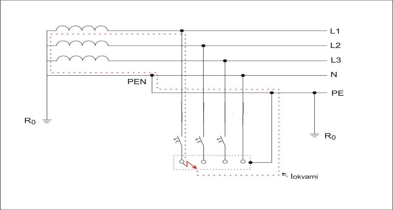 In a TN installation system, a fault current powered by the phase voltage is conducted from the damaged equipment through the protective (PE) and protective-neutral (PEN) conductor, through the neutral point in the power source — the transformer — into the phase winding of the phase that powers the fault location. This path has an impedance ZS, which is the impedance of the fault loop. In this case, the following inequality condition must be met: