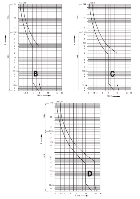 Depending on the level of cut-off current, we separate type B MCBs, where the cut-off is between 3 to 5x rated current, type C MCBs with 5-10x rated current and type D MCBs with 10-20x rated current.